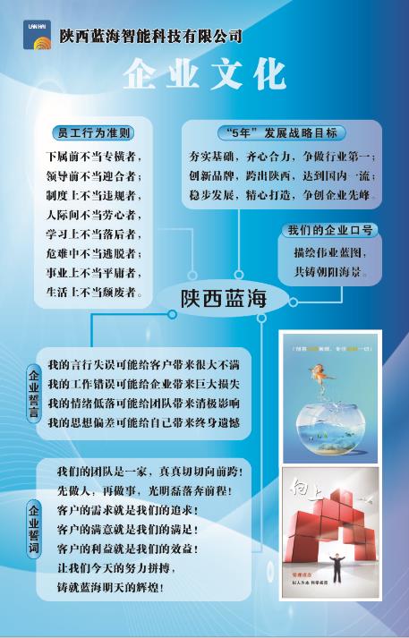隨著公司規(guī)模的增大、員工數(shù)量的增多,近日公司對企業(yè)文化進行更新。此次企業(yè)文化強調(diào)個人素質(zhì)的提升,從細節(jié)著手,具備憂患意識,上下同心,相互監(jiān)督,真正將藍海的企業(yè)文化融入日常生活中,全面提升藍海同仁綜合素質(zhì)。