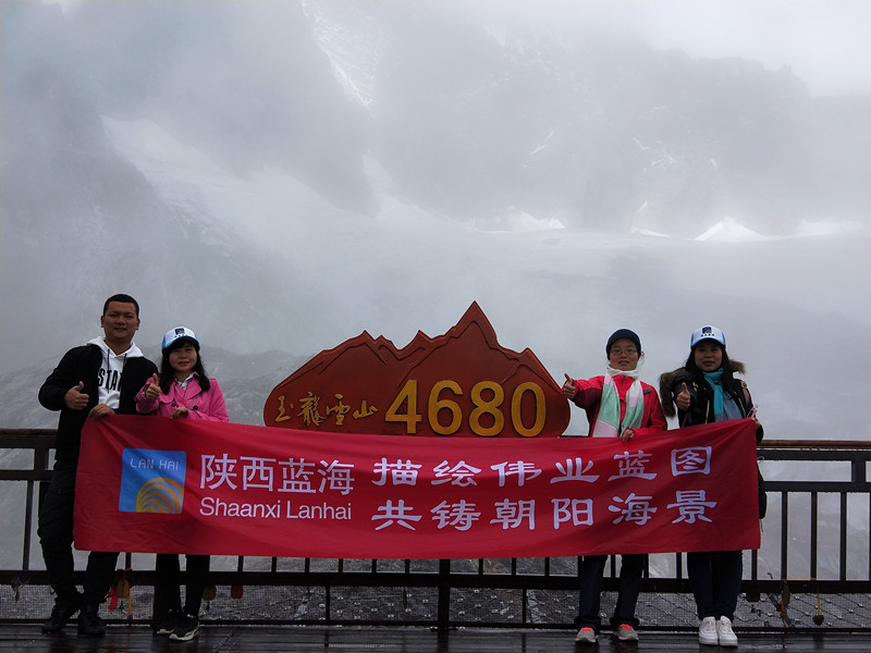 玉龍雪山不僅氣勢(shì)磅礴,而且秀麗挺拔,造型玲瓏,皎潔如晶瑩的玉石,燦爛如十三把利劍,在碧藍(lán)天幕的映襯下,像一條銀色的玉龍?jiān)谧饔篮愕娘w舞。面對(duì)高海拔缺氧的雨中雪山,特別是女同志,充分展現(xiàn)了巾幗不讓須眉的精神,挑戰(zhàn)極限,超越自我到達(dá)海拔4680米的頂峰,近距離感受雪山和冰川宏偉壯觀之景,完全體現(xiàn)了我們藍(lán)海人的頑強(qiáng)拼搏精神。